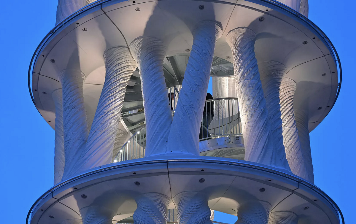 模块化设计允许拆卸和搬迁,符合循环建筑原则。干式连接和预应力接头有利于组件的重复使用,最大限度地减少浪费并延长材料使用寿命。虽然这种特制混凝土混合物的碳足迹比传统替代品更高,但团队还是采取了一些措施来减少对环境的影响。耐腐蚀不锈钢取代了传统的钢筋,以提高耐用性,而且这座塔的设计能够加速碳化——这是混凝土重新吸收大气中二氧化碳的自然过程。