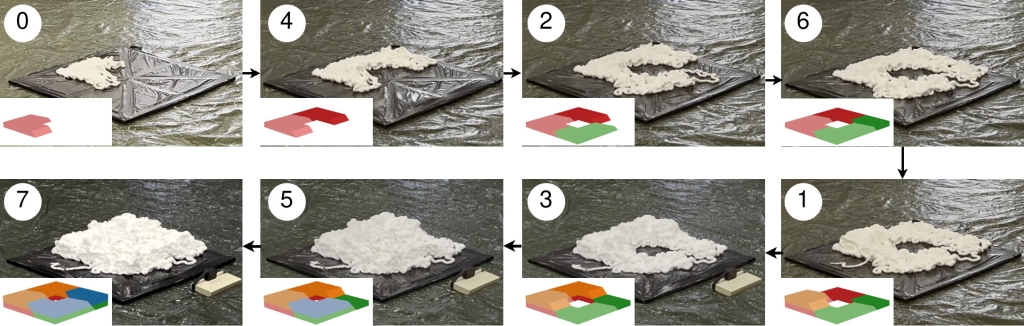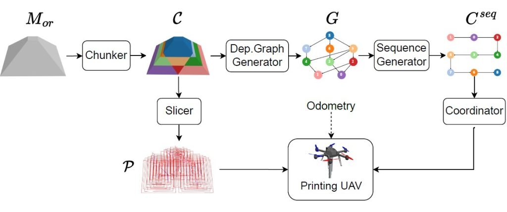 这种创新方法利用分解算法将CAD模型拆分为可独立打印的子结构,或称为“块”,并以依赖关系图的形式进行组织。这些“块”根据打印可行性和连接约束的顺序被分配给无人机。研究团队定制了一架六旋翼飞行器,装备有装填可发性聚氨酯泡沫的加压罐。无人机在飞行过程中,根据Cura切片软件生成的制造路径,挤出材料进行打印。