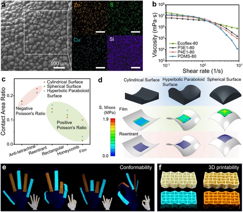 所配制的机械发光墨水由聚二甲基硅氧烷(PDMS)、Ecoflex硅胶与ZnS基荧光颗粒混合而成,具备优异的剪切稀化性能,有利于连续挤出与成形。有限元分析(FEA)模拟进一步验证了它对不同几何表面的适应能力。