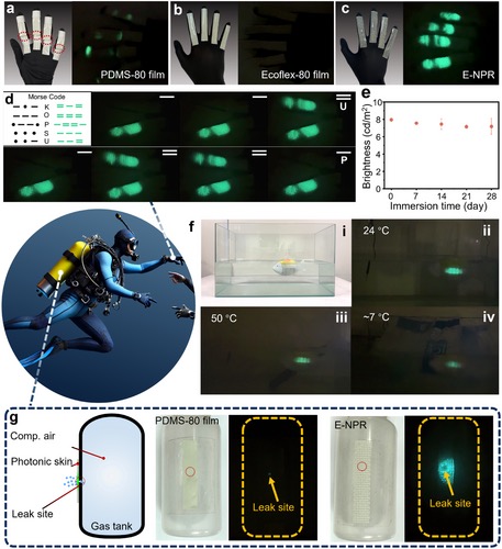 研究团队开发了一种基于视频的实时机械发光亮度测量方法,并将该材料集成至可穿戴设备(如手套),成功实现水下摩尔斯电码通信。此外,这种光子皮肤可对气体泄漏等机械损伤区域发出发光警示,进一步展示了它在安全监测中的实际价值。