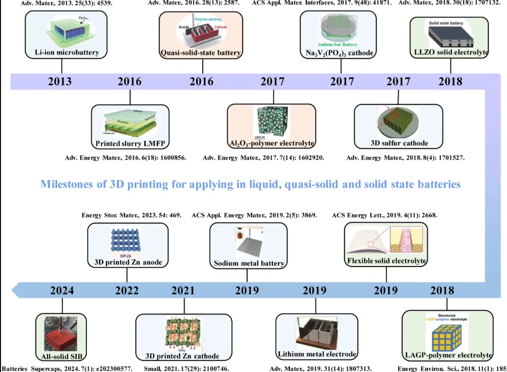 图1展示了3D打印在液态、准固态和固态电池中的应用里程碑,反映了从2013年首次用于锂离子微电池到2024年在钠离子电池和锌离子电池等领域的应用进展。