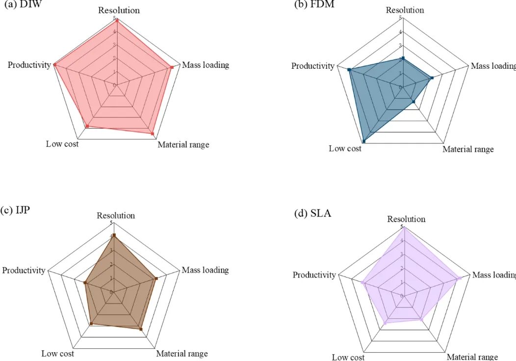 图3对比了五种关键3D打印技术在电池制造中的特性,包括打印分辨率、材料选择性、生产效率和成本等。