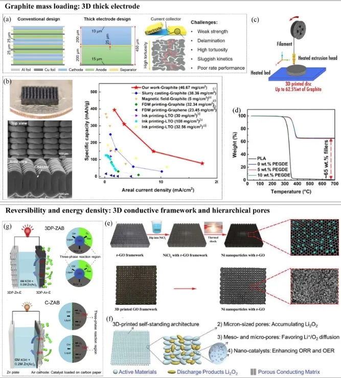 图4展示了3D打印碳基材料的应用实例,包括厚石墨负极和用于Li-CO₂电池的碳基框架。