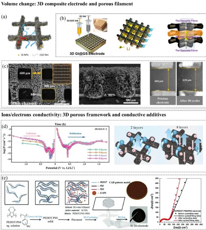 图5为3D打印硅基负极的结构示意图,展示了如何通过3D打印缓解硅基负极的体积变化和提升离子/电子传导能力。
