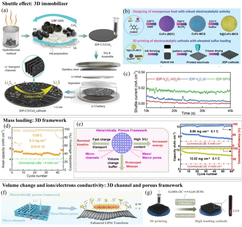 图7聚焦于3D打印硫基正极,展示了如何通过3D打印优化硫正极的接触面积和离子/电子传输路径。