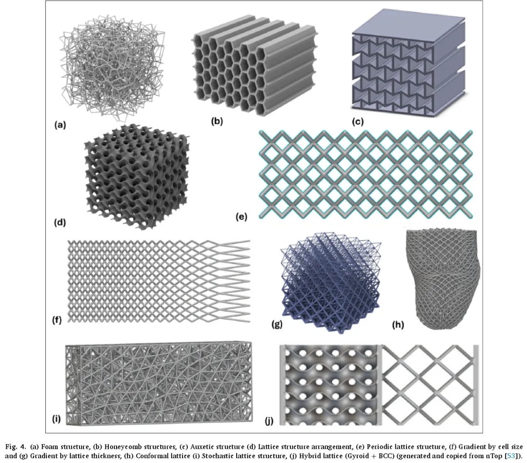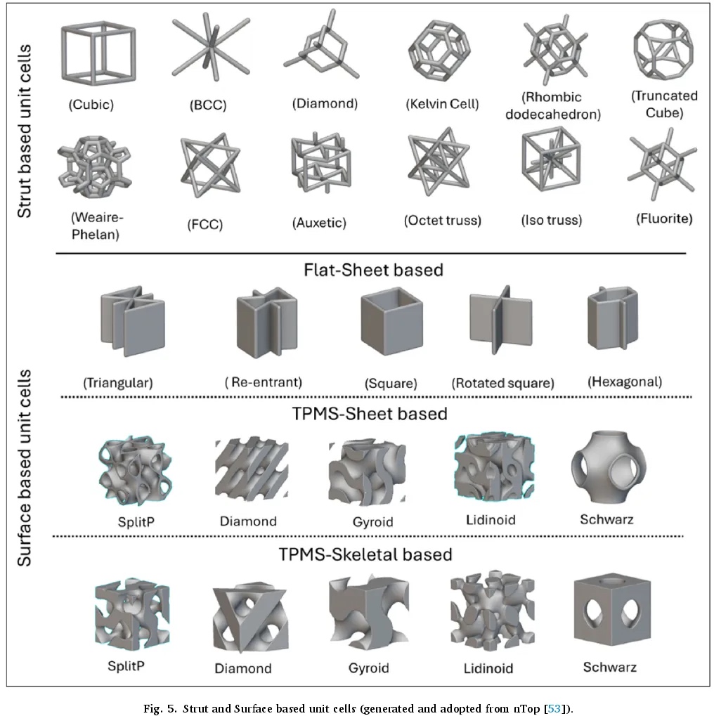 此外,文献中还概述了增材制造晶格结构中常用的不同类型单元胞拓扑结构,包括基于支柱和基于表面的晶格结构,如图 5