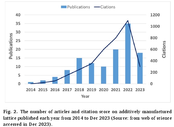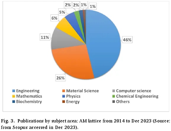 月发表的关于增材制造晶格结构的文章数量、引用分数以及按学科领域的分布情况,表明在搜索期间该领域的研究呈上升趋势,也说明了增材制造晶格结构研发的重要性日益增加。