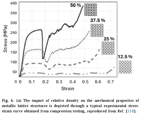 此外,不同桁架晶格的对比研究发现,带有圆角的八面体桁架结构由于其较低的相对密度,比没有圆角的结构具有更高的机械抗压强度。另一方面,金字塔形晶格桁架结构在较高的相对密度下表现出增强的压缩性能,观察到的失效模式包括断裂、稳定变形和软化。此外,在增材制造的晶格结构中,相对密度与弹性模量、屈服强度和极限强度呈正相关。最近的研究还发现,新开发的三维晶格超材料的弹性模量随相对密度线性增加,与传统晶格结构相比,刚度得到了提高。此外,研究表明,较高的密度通常会提高