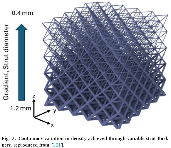 最近的研究表明,修改单元胞参数(如支柱厚度、长度和单元胞大小或它们的组合)可以导致不同的致密化模式,从而产生独特的机械响应。研究突出了调整支柱厚度对晶格结构内密度梯度的影响,范・格伦斯文等人的研究证明了这一点,他们观察到在三层规则菱形单元胞中支柱厚度的增加。马斯克里等人进行了研究,比较了梯度体心立方(BCC)和