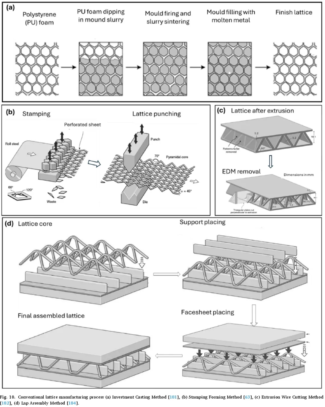 种基于支柱的晶格,通过组合两个或更多单元胞(如立方和对角单元胞)创建了一个名为混合单元胞的组合单元胞。他们发现这种混合晶格拓扑方法可以减少各向异性行为并增强力学性能。奥巴迪穆对金属和非金属晶格结构的压缩行为进行了全面综述,研究了优化技术、失效机制,同时强调了对金属基晶格结构研究的不足,揭示了晶格在结构应用中的重要性。胡等人展示了由碳纤维增强复合材料晶格桁架组成的夹层板的设计,展示了其强度和失效模式。耿研究了