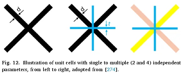 尽管增材制造能够创建跨越多个数量级的高度复杂形状和结构特征,但当前的增材制造过程在可制造性和后处理方面仍然面临挑战。因此,结构设计必须考虑诸如最小特征尺寸、自支撑特性(避免关键的悬垂部分)、去除未固化粉末或树脂的可达性,以及对辅助支撑结构的需求等因素。在多尺度设计中,通过仔细选择合适的单元胞,如梁状晶格单元或自支撑菱形单元,可以满足这些要求。