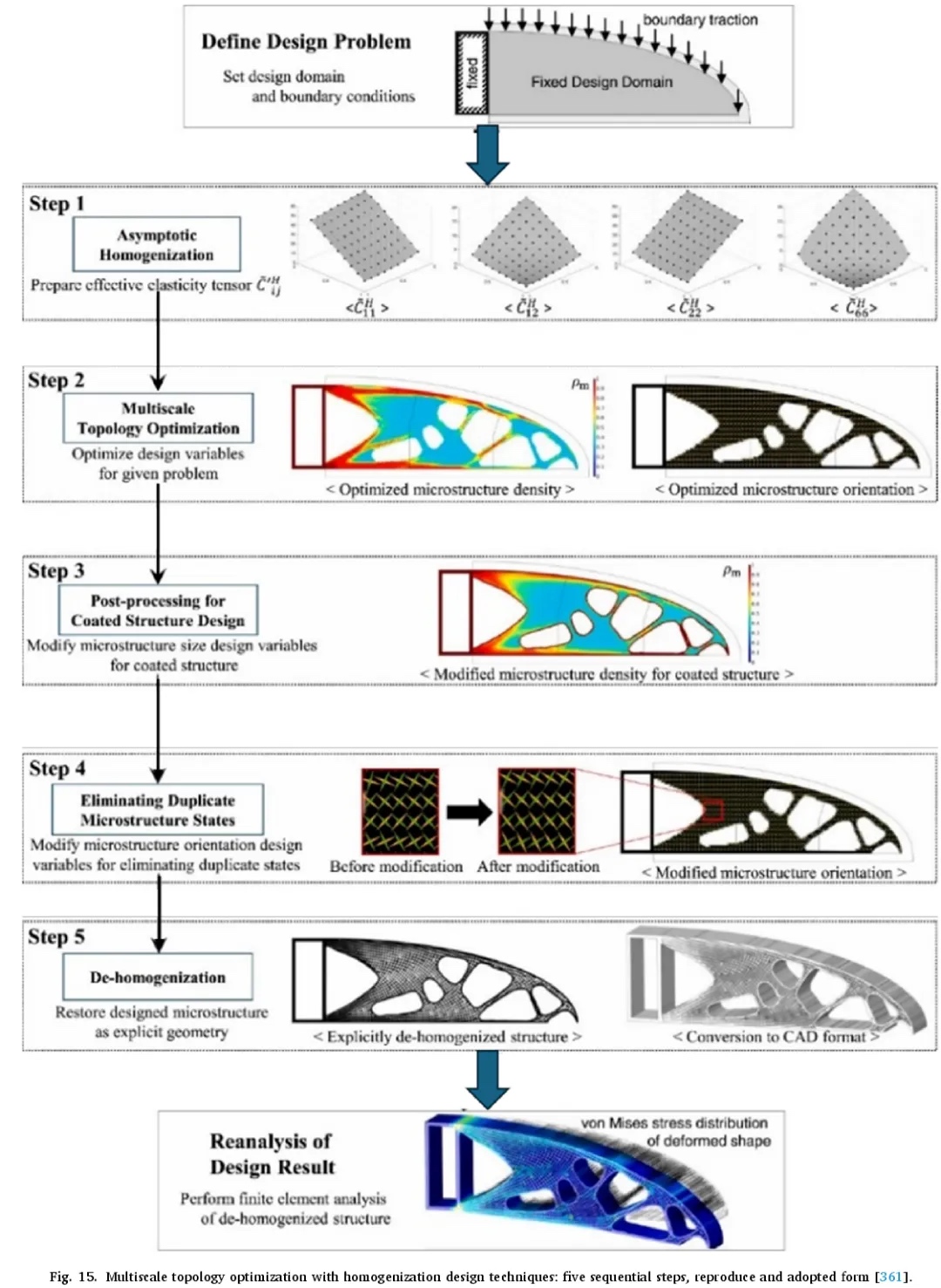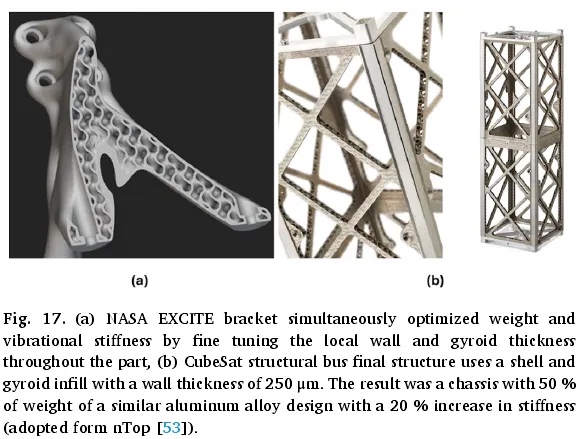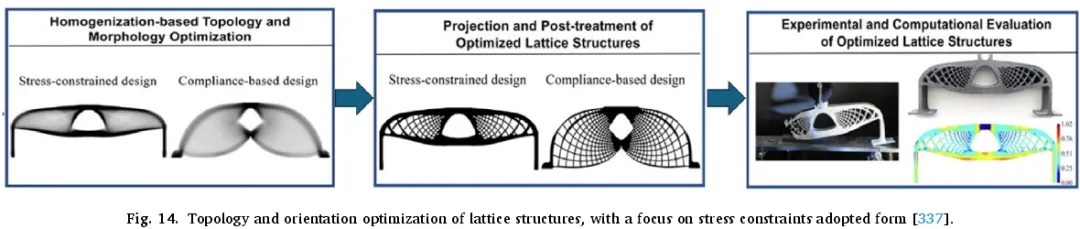 等人提出了一种源自竹子和鱼鳞重叠图案的新型混合晶格结构。他们通过改变单元胞壁厚度对轻质结构进行了优化,并在航空航天领域获得了高压缩性能。同样,作者开发了一种使用新型逆优化框架设计高端航空航天夹层板的新方法。该框架利用多孔单元胞进行核心拓扑优化,满足了柔度和热约束。结果表明,最终产品可以轻松转换为数字切片,证实了该框架在制造