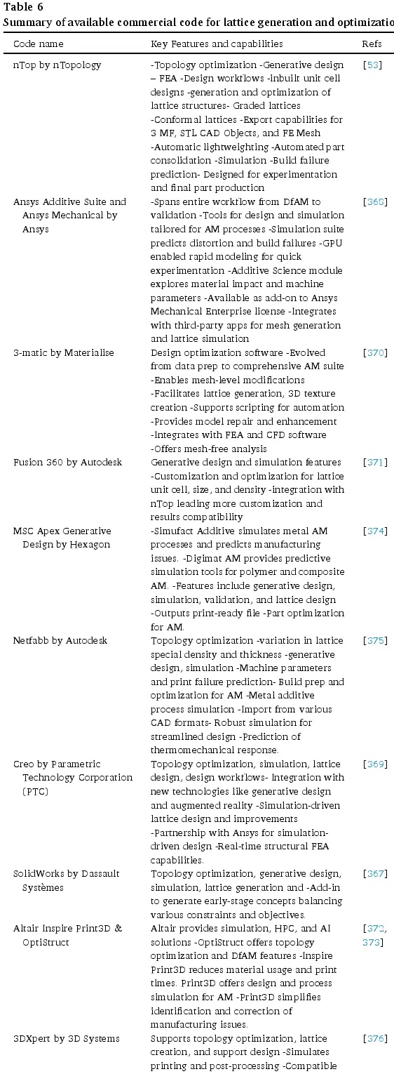 详细总结了可用于晶格结构设计和优化的不同商业代码的功能。