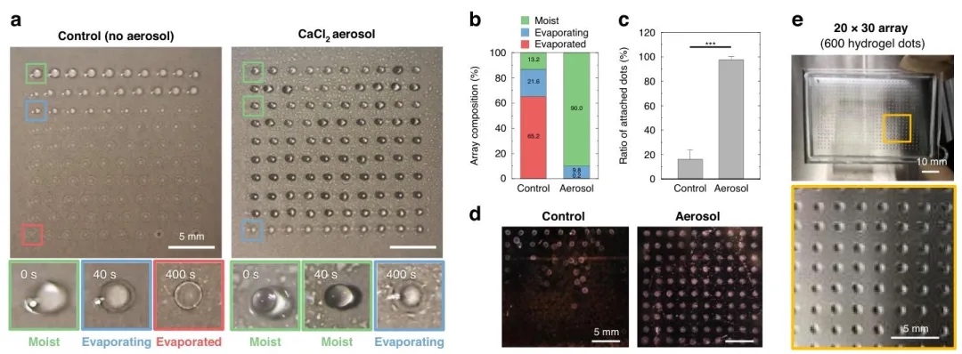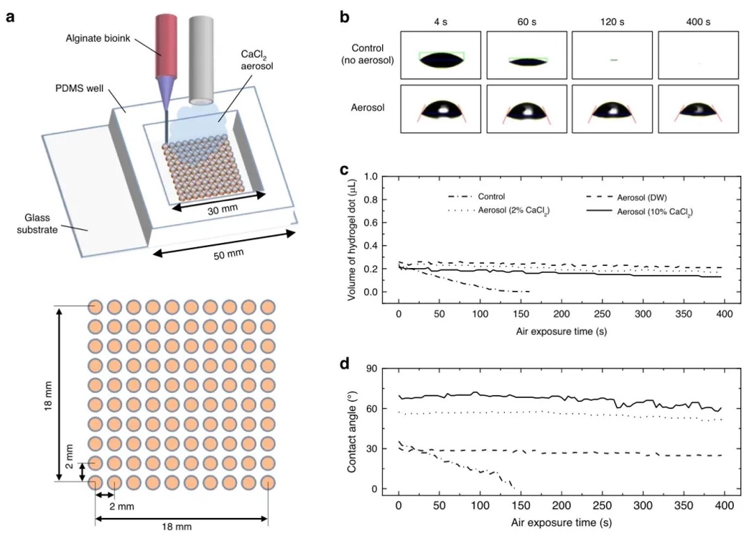基于气溶胶交联的稳定微挤出打印技术原理,通过在微挤出打印过程中引入10%氯化钙(CaCl₂)气溶胶,研究了纳升级水凝胶微滴在空气暴露下的扩散和蒸发问题。结果表明,气溶胶通过实时凝胶化和维持湿润环境,使250纳升藻酸盐微滴在400秒内体积保持率从对照组的0%提升至97%,接触角从0°增加至60°,显著改善了打印分辨率和稳定性,且10×10阵列的附着率从对照组的20%提升至97%。