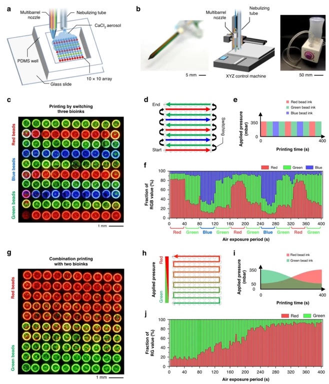 多成分异质图案阵列的打印与表征,通过多枪管喷嘴结合气溶胶交联,研究了三材料切换(红/绿/蓝荧光珠)和双材料梯度混合(红+绿荧光珠)的打印能力。结果表明,阵列中荧光珠比例与气压调控的材料挤出比例高度吻合(R²>0.95),成功制备了条带化和梯度化的多成分阵列,验证了多材料精准控制的可行性。