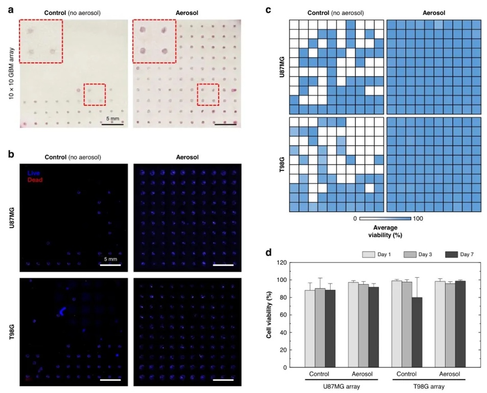 检测,研究了含U87MG(TMZ敏感)和T98G(TMZ耐药)细胞的单成分阵列在气溶胶辅助打印后的性能。结果显示,气溶胶组细胞存活率在7天内维持>90%,显著高于对照组(<50%),且阵列附着稳定,证明了该技术在细胞封装中的适用性。