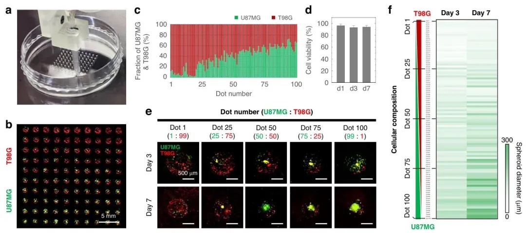 Park教授团队开发了一种基于多生物墨水打印和气溶胶交联技术的微挤出生物打印方法,通过在打印过程中引入氯化钙气溶胶,有效抑制了纳升级水凝胶微滴的扩散和蒸发,使打印稳定性和产量提升至99%以上。该团队进一步利用多枪管喷嘴构建了包含100种不同细胞组成的胶质母细胞瘤(GBM)多成分阵列,复现了肿瘤内异质性微环境,并成功应用于替莫唑胺(TMZ)的药效评估。实验表明,该阵列可同步分析不同细胞组成对药物的响应差异,为肿瘤药物筛选提供了高通量平台。相关工作以“Bioprinting