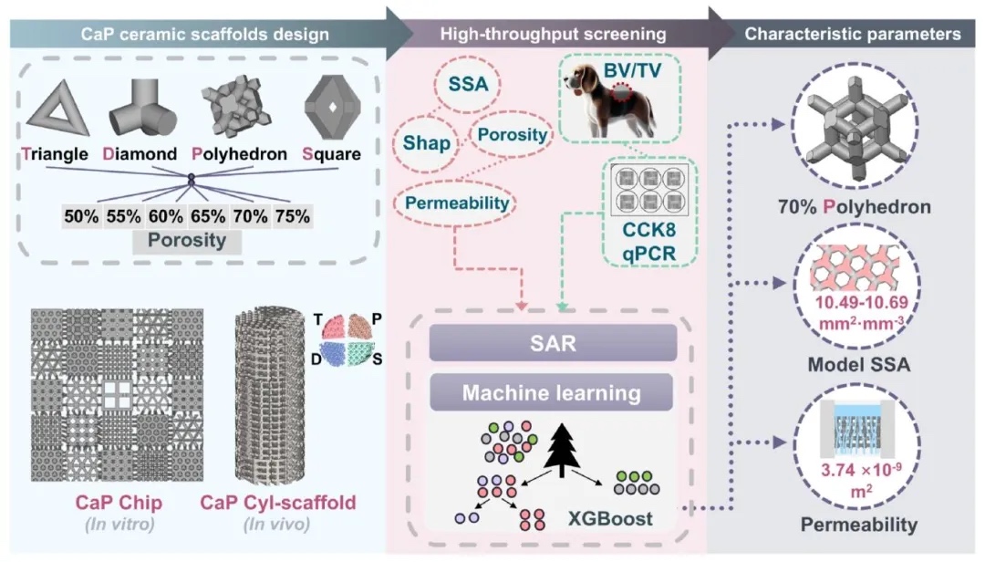 3D打印技术制备了包含24种不同孔隙结构(三角形、菱形、方形、多面体,孔隙率50%~75%)的磷酸钙(CaP)陶瓷支架,结合高通量筛选、体外(BMSCs共培养)和体内(比格犬肌肉植入)评价,以及机器学习(XGBoost模型)和非线性拟合,系统探究了支架结构参数与骨诱导性的复杂关系。