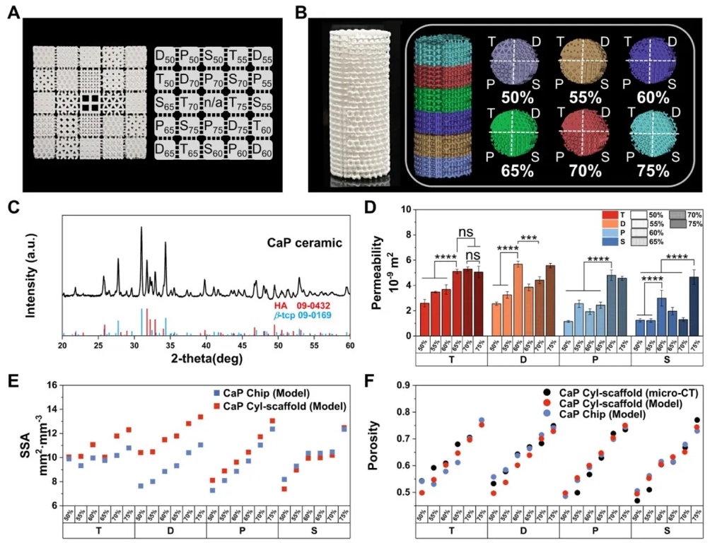 3D打印CaP芯片/圆柱状支架的表征,通过扫描电子显微镜(SEM)、X射线衍射(XRD)、微CT等方法,分析了支架的微观形貌、物相组成、孔隙率、比表面积(SSA)和渗透率。结果显示,打印支架结构完整,主要成分为β-TCP和HA,孔隙率与设计值一致,SSA随孔隙率增加而增大,渗透率在不同孔结构和孔隙率下呈现复杂变化规律。
