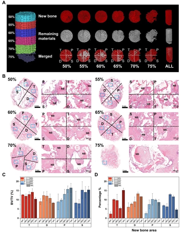 CaP圆柱状支架的体内评价,通过微CT三维重建和组织学染色(H&E),分析了支架植入比格犬背部肌肉180天后的新骨形成情况。结果显示,65%-70%孔隙率的多面体和方形结构新骨形成量较高,75%孔隙率结构因降解严重导致骨组织较少,验证了孔隙率对体内骨诱导性的关键作用。