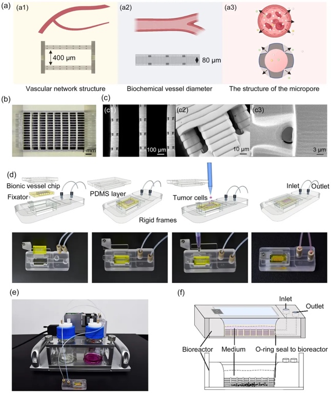 该装置通过中空管状"人工血管"(图1a)模拟血管结构主体,其管壁设计7-10μm孔径微孔以实现生理级营养扩散(图1b-c)。为精准模拟交叉血管网络拓扑,装置内集成5层仿生结构单元——每层包含14条平行"人工血管"及7条横向支撑梁(图1a-b)。生物相容性验证表明:BIO树脂浸提液共培养体系对类器官扩增无不良影响,且在浓度梯度测试中,人源肺癌(肿瘤组织)、气道与肾脏(正常组织)来源类器官的活性均未出现显著性抑制。