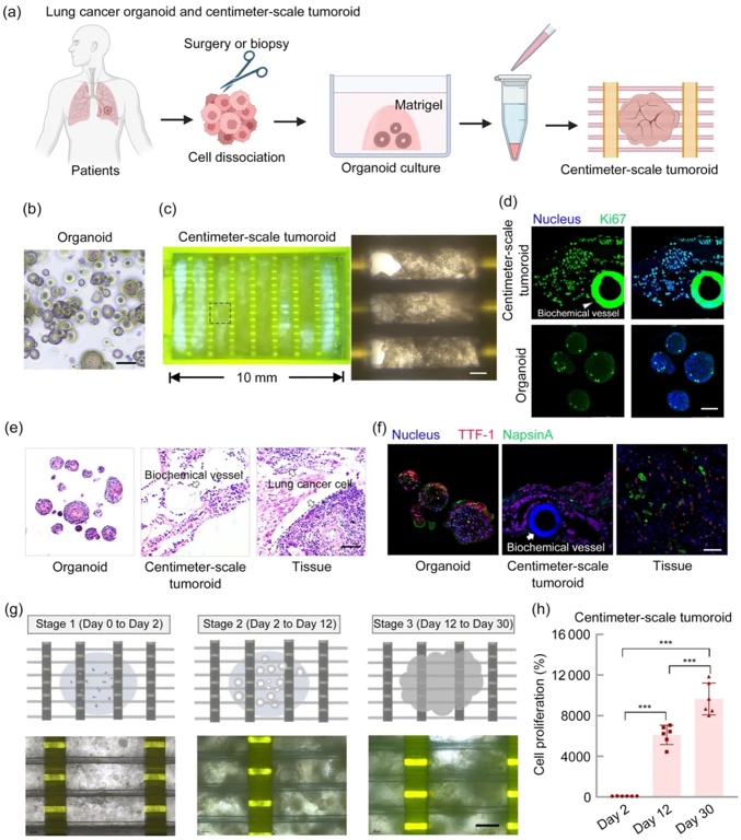 首先,研究团队构建了肺癌类器官(图2a),其传统培养7天后直径停滞于约200μm(图2b)。将经消化的肺癌类器官悬浮于基质胶后接种至毛细血管芯片,成功实现类器官片段移植,并持续培养超过30天(图2c)。基于该模型对肿瘤类器官长周期、大尺度培养的显著支持能力及其独特生长表型,将其命名为"厘米级肿瘤类器官"(图2a,c)。Ki67免疫组化证实肺癌厘米级类器官的增殖活性显著高于传统类器官(图2d)。