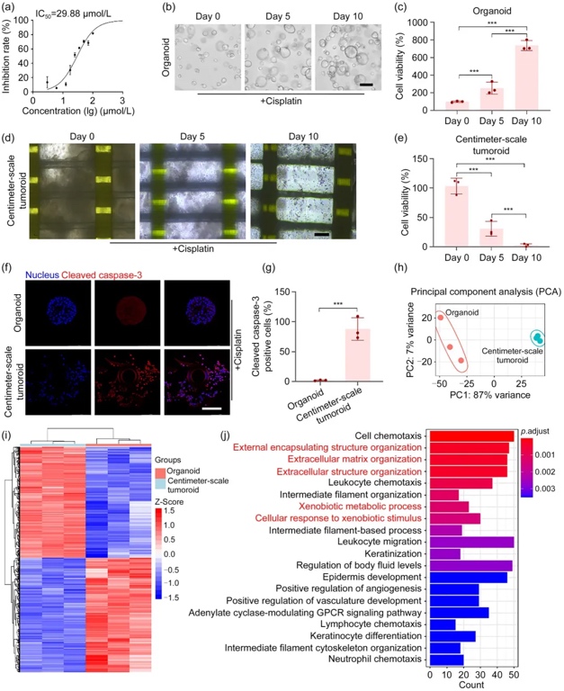 顺铂作为不可切除性非小细胞肺癌(NSCLC)的标准化疗药物,亦广泛用于小细胞肺癌的治疗。为评估厘米级肿瘤类器官对抗癌药物的反应特性,本研究首先检测传统类器官对顺铂的敏感性,测得肺癌类器官半抑制浓度(IC50)为29.88μmol/L(图3a)。随后采用10μmol/L顺铂处理厘米级模型,药物干预5天后即出现大规模肿瘤细胞死亡(图3d-e);持续暴露10天后癌细胞被完全清除(图3b-c)。免疫荧光成像揭示,同等剂量顺铂在厘米级类器官中诱导的凋亡信号强度显著高于传统模型(图3f-g),证实厘米级体系对顺铂的响应灵敏度更高。