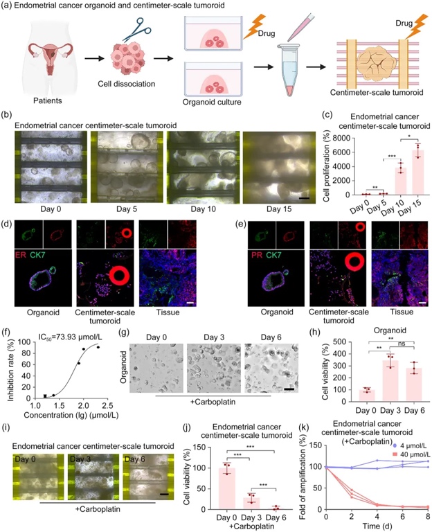 在药物反应评估方面,相较于传统类器官模型,本研究的厘米级类器官在相同卡铂浓度下表现出显著增强的药物敏感性(图4g-j)。该平台还可实现长期药效监测:如图4k所示,随卡铂浓度升高,厘米级类器官细胞快速死亡。这表明子宫内膜癌厘米级类器官芯片不仅突破肿瘤生长尺寸限制,更精准模拟肿瘤微环境,还为药物疗效评估提供了更可靠的模型基础。