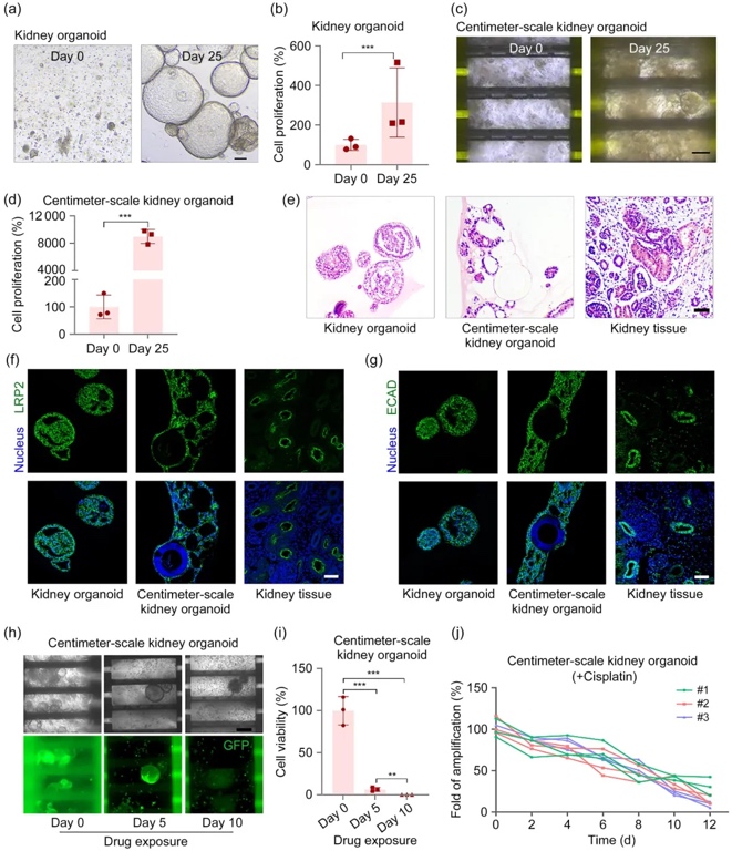 为动态评估顺铂的肾毒性效应,研究采用绿色荧光蛋白(GFP)标记厘米级肾脏类器官以监测细胞增殖状态(图5h)。经30天培养的模型中施加顺铂处理后,第4天即观察到细胞死亡现象,类器官结构瓦解并形成囊泡样改变,精准模拟了顺铂暴露下近端肾小管典型的扩张病理特征(图5h-i);药物暴露超过10天后,细胞死亡率>50%(图5j)。上述发现证实,毛细血管芯片技术可成功构建具备天然肾脏组织特性的厘米级类器官芯片,并能精确复现顺铂诱导的肾毒性反应机制。