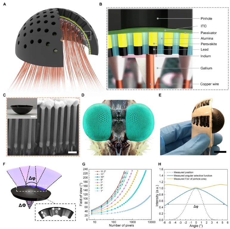 香港科技大学范智勇教授团队创新开发了半球形针孔复眼(PHCE)系统,集成了3D打印的蜂窝状光学结构和半球形的全固态高密度钙钛矿纳米线(PNA)光电探测器阵列,并以超大视场角与优异的动态响应能力,登顶《Science
