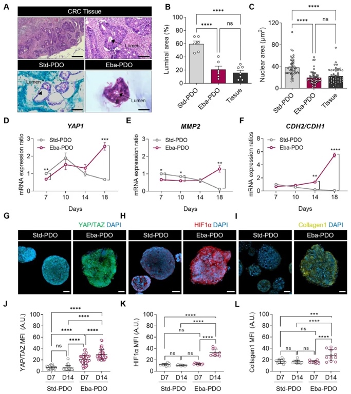 类器官的肿瘤微环境模拟与病理特征分析,通过H&E染色、免疫荧光(YAP/TAZ、HIF1α、胶原I)和qPCR,对比Eba-PDOs与Std-PDOs的形态和分子表达。结果表明,Eba-PDOs核面积较Std-PDOs缩小1.7倍,机械应力标志物YAP1表达上调4倍,缺氧标志物HIF1α和胶原I沉积显著增加,且CDH2/CDH1比值升高(提示上皮-间质转化),重现天然肿瘤的细胞挤压、低氧环境和ECM重塑特征。