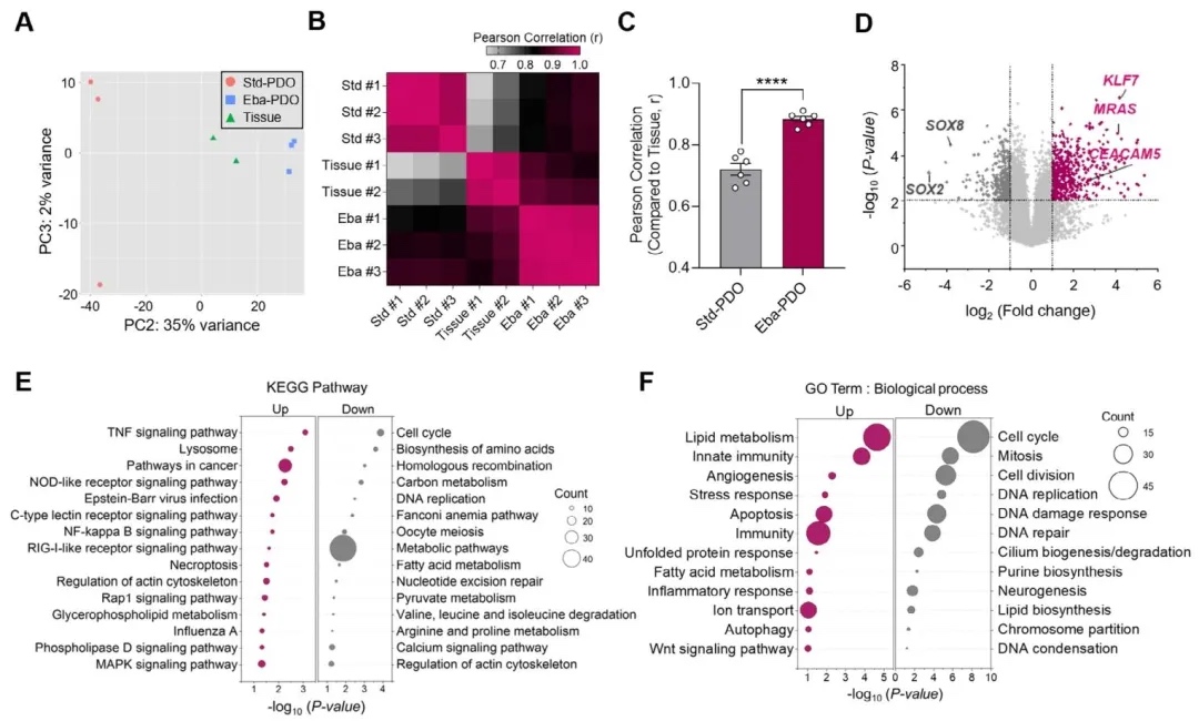 类器官与原发组织的转录组差异及功能富集,通过RNA测序和主成分分析(PCA),比较Std-PDOs、Eba-PDOs和患者原发组织的基因表达谱。结果表明,Eba-PDOs转录组与原发组织的Pearson相关系数(r=0.84)显著高于Std-PDOs(r=0.48),差异表达基因(DEGs)富集于TNF信号、NF-κB炎症通路及脂质代谢过程,其中CEACAM5、KLF7等结直肠癌关键基因表达更贴近真实肿瘤。