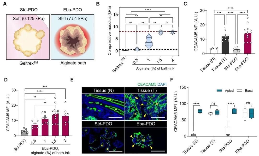 kPa)条件下,Eba-PDOs的CEACAM5表达水平与原发组织一致,且异常定位于细胞基底外侧(模拟肿瘤细胞极性丧失),而软基质(0.5%海藻酸盐)无法诱导该表型。