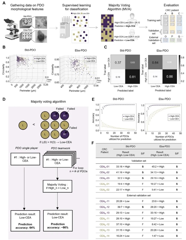 基于形态学的无标记预测模型构建与验证,通过提取177个Eba-PDOs的亮度场图像特征(面积、周长、圆度),训练随机森林算法并结合多数投票法(MVA),建立高/低CEA分类模型。结果表明,使用50个Eba-PDOs时预测准确率达98%,显著优于Std-PDOs(37%),且在7例新患者的外部验证中实现100%准确分类。