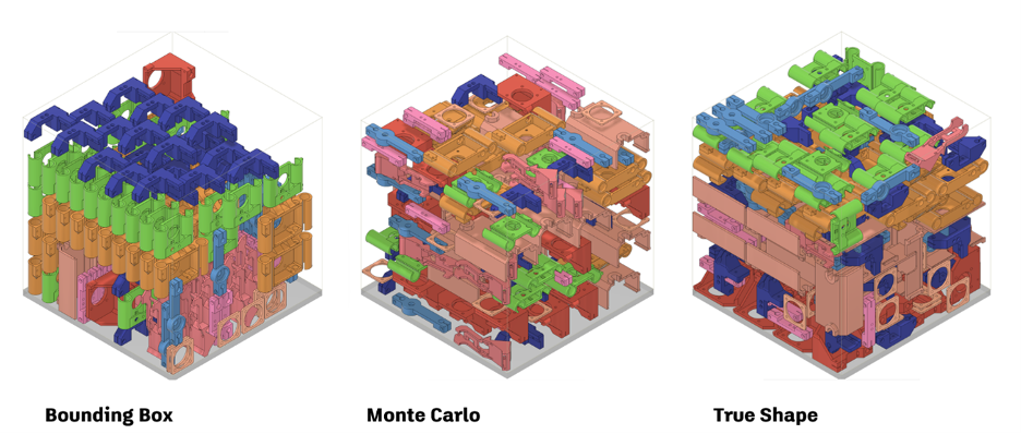 新款API 与 2025 年 5 月 Fusion 更新中推出的几项增材制造改进一同亮相。其中包括 True Shape 填充方法,这是一种更高效的 3D 嵌套方法。与根据矩形范围排列零件的边界框填充不同,True Shape 会分析每个模型的实际几何形状。这有助于减少材料浪费,并提高多部件构建的空间利用率,对于复杂或有机形状的组件尤其有用。