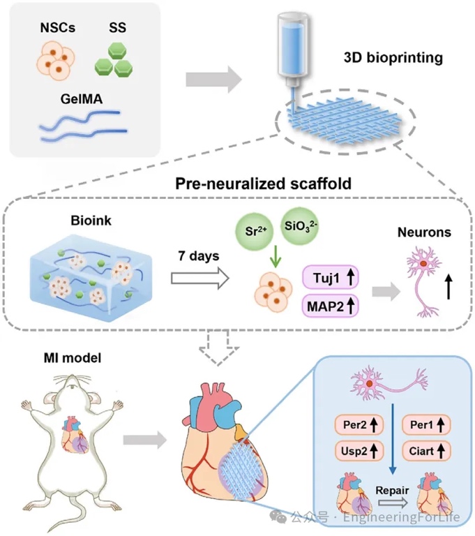 综上,本文开发了一种基于锶硅酸盐(SrSiO₃)微粒的预神经化支架,该支架可有效地促进神经干细胞分化为成熟神经元,并通过激活心肌组织中与生物钟相关的基因(如Per2、Per1、Usp2和Ciart),显著增强了心肌梗死后的心肌修复和心脏功能恢复。这一创新策略不仅改善了心肌细胞的成熟和同步收缩,还促进了心肌组织的再生和血管重建,为心肌梗死的治疗提供了新的视角和潜在的临床应用前景。
