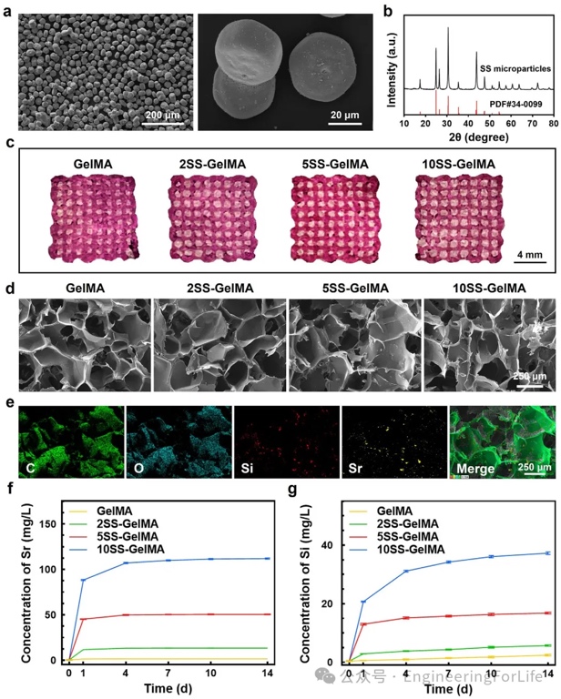 作者首先描述了含锶硅酸盐(SS)微粒的3D打印支架的制备和表征过程。SEM观察到SS微粒呈现六方柱状形态(图1a),XRD确认其相与SrSiO3匹配(图1b)。将不同浓度的SS微粒(0%、2%、5%、10%)与明胶甲基丙烯酰基(GelMA)基质混合,制备出一系列生物墨水,并利用流变学分析发现这些生物墨水在温度敏感性、剪切变稀性能和屈服应力方面没有显著差异。随后,通过3D生物打印机将这些生物墨水打印成网格状支架(图1c),SEM图像显示了支架的多孔结构,且SS微粒在GelMA基质中分布均匀(图1d和图1e)。此外,作者还测定了不同浓度SS微粒的支架在培养14天内的Sr和Si离子释放情况(图1f和图1g),发现含2%和5%