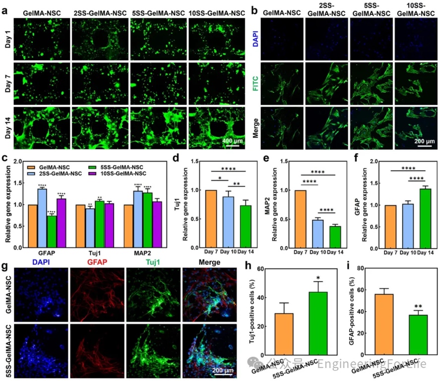 图2d-f)。RT-qPCR结果显示,5SS-GelMA-NSC支架在培养7天后,与神经元分化相关的基因(如Tuj1和MAP2)表达显著高于对照组,而胶质细胞相关基因(GFAP)表达较低(图2c)。免疫荧光染色直观地显示了5SS-GelMA-NSC组中Tuj1+神经元的比例高于对照组(图2g-i)。