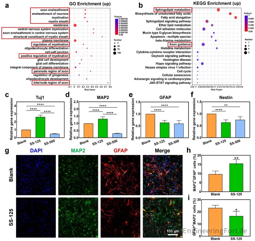 接着,作者探讨了锶硅酸盐(SS)微粒对神经干细胞(NSCs)预神经化效应的潜在机制。对在5SS-GelMA-NSC支架和对照组GelMA-NSC支架中培养7天的NSCs进行了转录组测序,发现与对照组相比,5SS-GelMA-NSC组中有322个基因上调,123个基因下调。基因本体(GO)分析显示上调基因主要与髓鞘和轴突相关,京都基因与基因组百科全书(KEGG)分析揭示了两组在鞘脂代谢和轴突引导方面存在显著差异(图3a-b)。此外,还通过将NSCs与不同浓度的SS微粒提取液共培养,发现500
