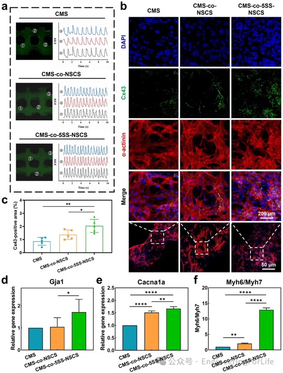 接着,作者进一步分析了预神经化支架对体外心肌构建体(CMS)的影响。通过3D打印技术制备了含心肌细胞的支架(CMS),并与预神经化支架共培养,评估了预神经化支架对心肌细胞结构和功能的促进作用。与单独培养的CMS相比,与5SS-GelMA-NSC预神经化支架共培养的CMS(CMS-co-5SS-NSCS)展现出最强的收缩行为(图4a)。CMS-co-5SS-NSCS组显示出良好的钙信号同步性,表明心肌细胞之间的电信号传递更为协调。免疫荧光染色显示CMS-co-5SS-NSCS组中Cx43表达水平较高,解释了心肌细胞收缩的良好同步性(图4b-c)。同时,α-actinin的广泛分布和明显的肌节形态表明心肌较为成熟。CMS-co-5SS-NSCS组中与缝隙连接相关的Gja1(Cx43)、钙信号调节相关的Cacna1a以及心肌收缩相关参数Myh6/Myh7的表达水平较高,显示出心肌细胞的成熟度(图4d–f)。综上,预神经化支架在体外对心肌修复具有良好的促进作用。