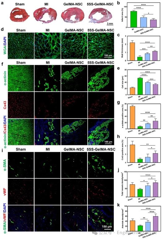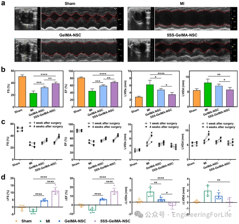 最后,作者分析了预神经化支架对心肌梗死(MI)大鼠模型心功能重建的影响。将预神经化支架(5SS-GelMA-NSC组)和对照支架(GelMA-NSC组)分别移植到MI大鼠的心脏表面,通过超声心动图评估心脏功能。结果显示,与未移植支架的MI组相比,移植预神经化支架的大鼠在术后4周的心脏收缩力显著提高,左心室缩短分数(FS)和射血分数(EF)均有所改善,而左心室内径收缩末期(LVIDs)和舒张末期(LVIDd)的长度则有所减小(图5a-b)。与GelMA-NSC组相比,5SS-GelMA-NSC组的大鼠在这些心脏功能参数上表现出更显著的恢复(图5c-d)。上述结果表明预神经化支架能够有效促进心肌梗死后的功能恢复。