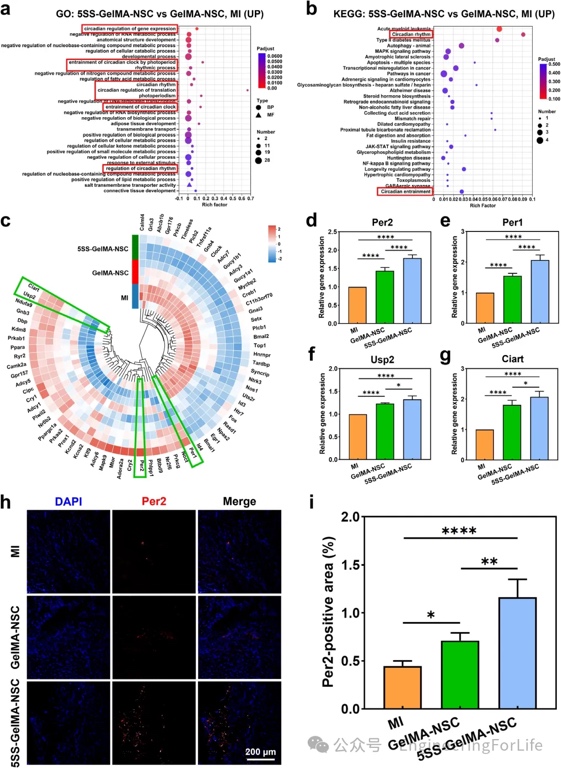 最后,作者研究了预神经化支架修复心肌梗死(MI)的潜在机制。作者对MI组、GelMA-NSC组和5SS-GelMA-NSC组大鼠的心肌组织进行了转录组测序,发现5SS-GelMA-NSC组与GelMA-NSC组及MI组相比,差异表达基因(DEGs)显著增加。基因本体(GO)和京都基因与基因组百科全书(KEGG)分析显示,这些基因主要与生物钟相关(图7a-b)。进一步分析发现,5SS-GelMA-NSC组中Per2、Per1、Usp2和Ciart这四个生物钟基因的表达水平显著高于其他两组(图7c)。实时定量聚合酶链反应(RT-qPCR)和免疫荧光染色结果也证实了这些基因在5SS-GelMA-NSC组中的高表达(图7d–g,