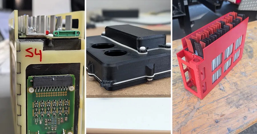 PCB 外壳、电池固定件等高压与低压系统部件外,Aixtreme Racing 也使用 PETG、PLA 和 PC