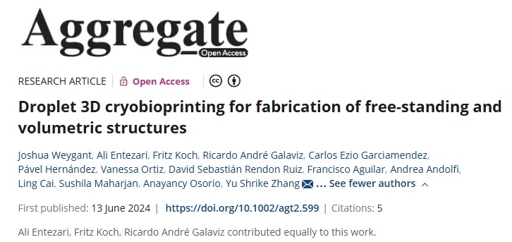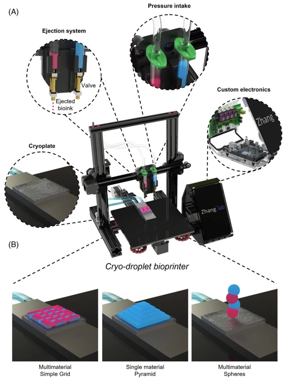 Zhang教授团队开发了一种液滴3D低温生物打印技术,通过将液滴打印与低温打印结合,利用低温板(-5至-15℃)使低黏度生物墨水(如7.5%