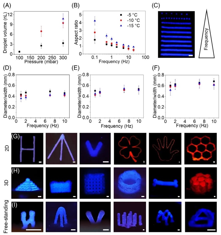 nL稳定液滴,通过单/多材料喷射成功构建金字塔、多层网格及字母“H”“V”等自立式结构,验证了低温冻结对维持低黏度墨水空间形态的关键作用,避免传统液滴打印的扩散坍塌问题。