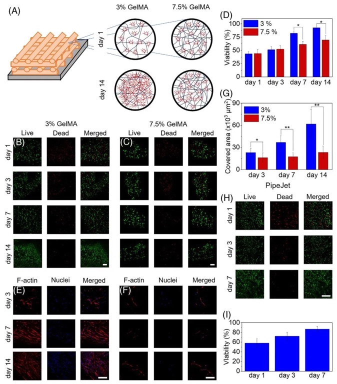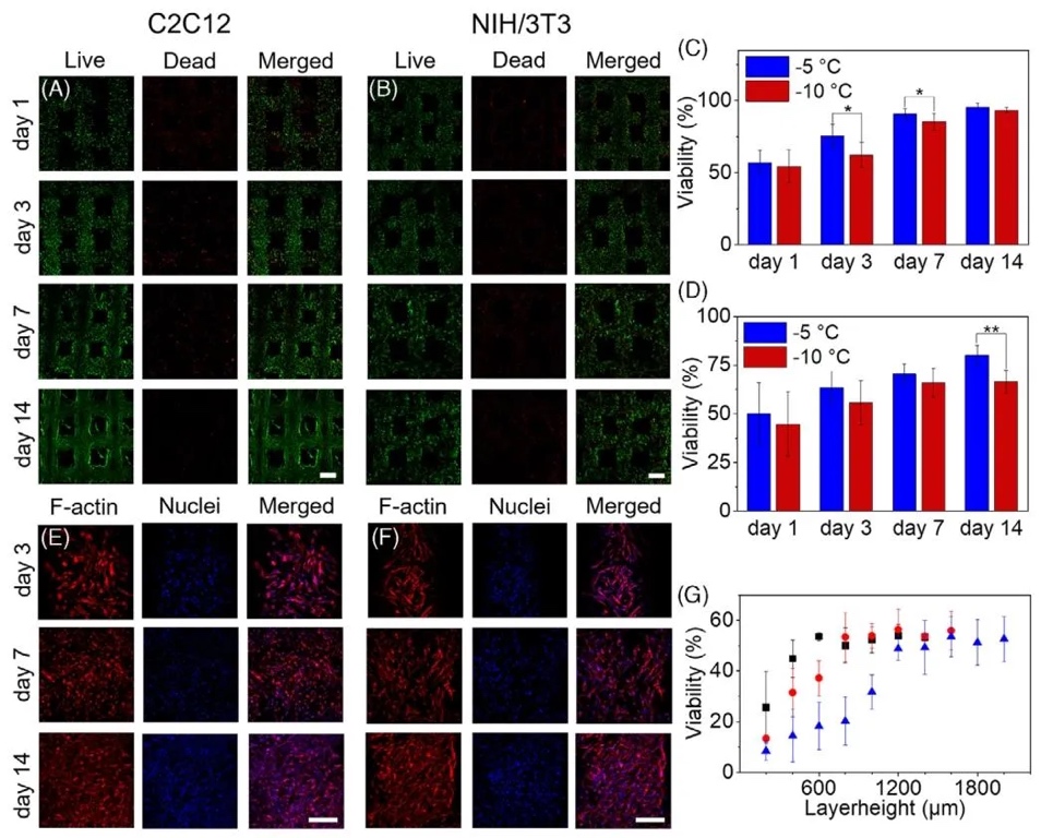 细胞封装存活率与形态演变图,通过活/死染色(Calcein-AM/PI)和免疫荧光染色(F-actin/DAPI),研究了C2C12肌细胞、NIH/3T3成纤维细胞在-5℃/-10℃打印后的存活与增殖行为。结果表明,初始存活率约50%,培养14天后升至80%-90%,细胞呈扩散生长并形成互连网络;星形胶质细胞在3%低浓度GelMA中铺展面积更大(14天达初始3倍),但结构稳定性随浓度降低而下降,提示需平衡细胞活性与力学性能。