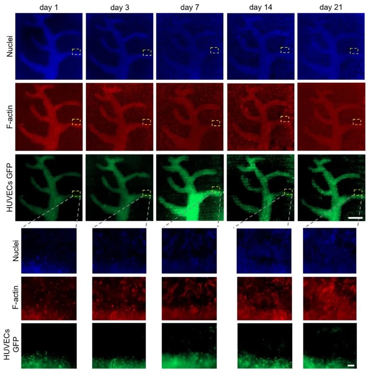 cells/mL),研究了多细胞类型的空间分布与相互作用。结果显示,HUVECs在肿瘤细胞层上方形成血管样结构,培养21天后交界处可见内皮细胞向肿瘤细胞方向萌芽,两组细胞存活率分别达90%和80%,证实该技术在构建血管化肿瘤模型中的应用潜力。