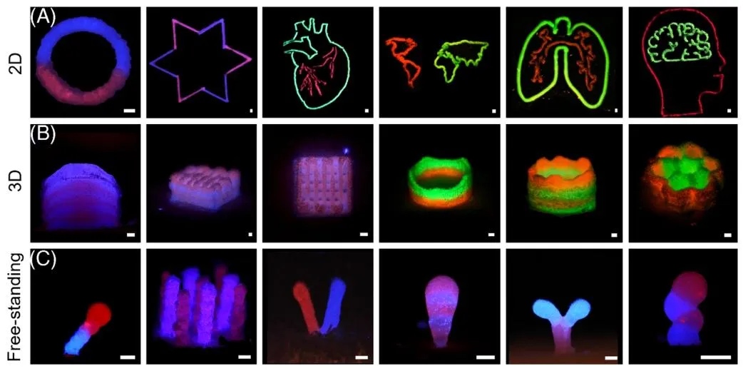 GelMA)在沉积后立即冻结,无需额外支撑即可形成自立式结构,同时避免多材料混合问题。该技术成功打印出金字塔、多层网格及字母“H”“V”等单材料或多材料复杂结构,并实现了C2C12肌成纤维细胞、NIH/3T3成纤维细胞等多种细胞的封装,细胞存活率在培养2-3周后达80%-90%,还构建了血管化乳腺癌模型验证多细胞共培养潜力。相关工作以“Droplet
