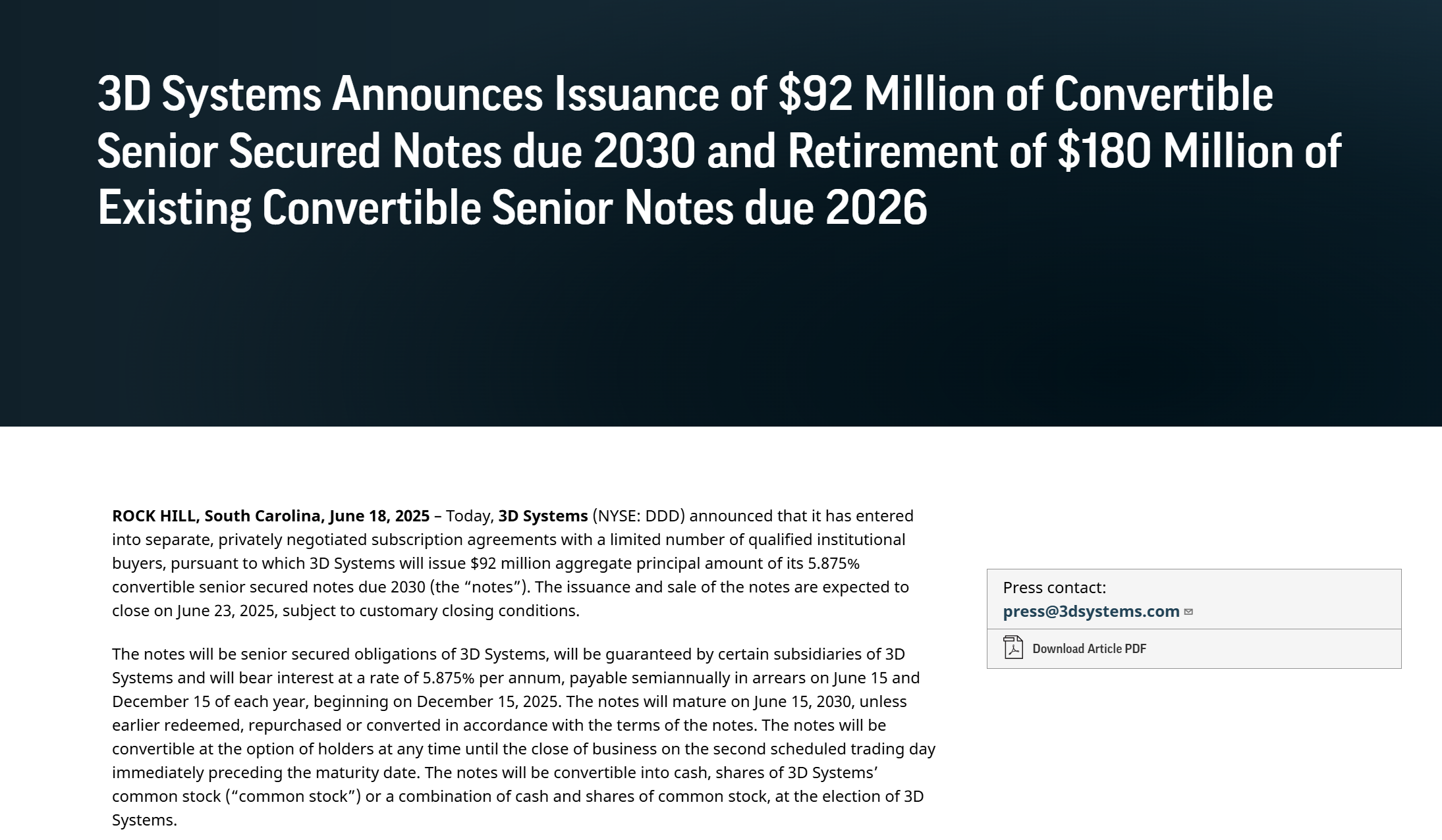 2025年6月,美国3D打印制造商3D Systems宣布发行总额为9200万美元的新一批可转换债券,这批债券将于2030年6月15日到期。根据与机构投资者达成的私募协议,3D Systems预计将在2025年6月23日完成这笔债券发行。新债券年利率为5.875%,每半年支付一次利息,首次付息时间为2025年12月15日。