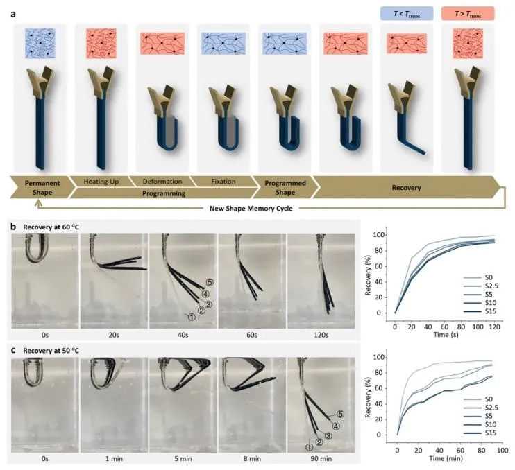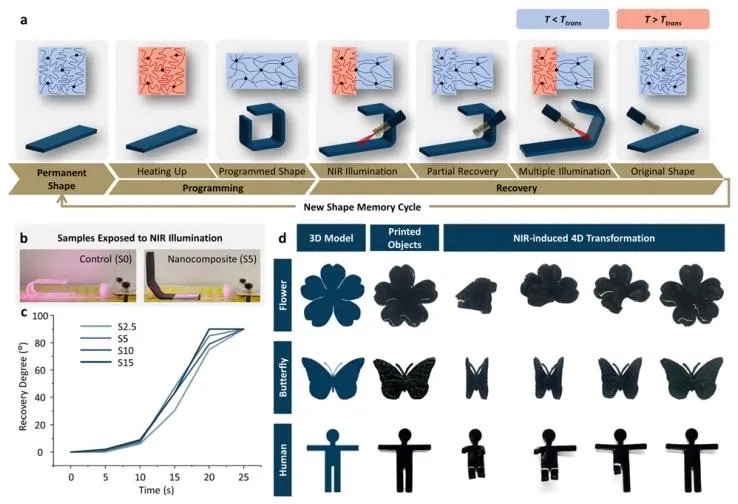 内恢复率超90%,且通过局部照射可实现“樱花绽放”“人体肢体伸展”等模型的分步精准变形,证明了NIR触发的时空可控性。